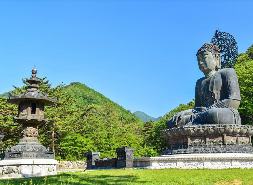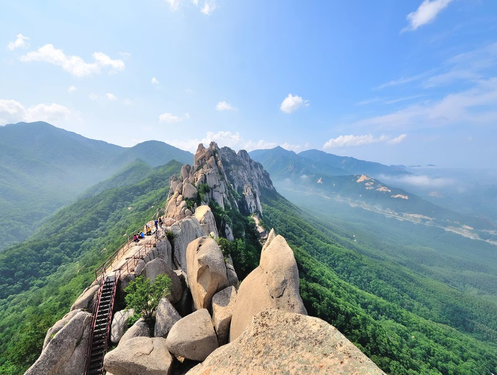 설악산은 태백산맥에서 가장 높은 봉우리로, 강원도 절경의 한 축을 담당하죠. 설악산 기슭 근처에선 통일대불을 놓치지 마세요. 높이 14.6m의 이 통일대불은 남북한의 평화통일에 대한 염원을 담고 있어요. 조금 더 가면 조선 시대에 창건된 신흥사를 만날 수 있어요.