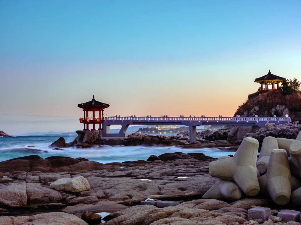 영금정은 속초의 대표적인 포토스팟이에요. 동명대교 끝자락에 위치한 이 화려한 랜드마크는 동명항 근처의 작은 바위 위에 세워져 있어요.