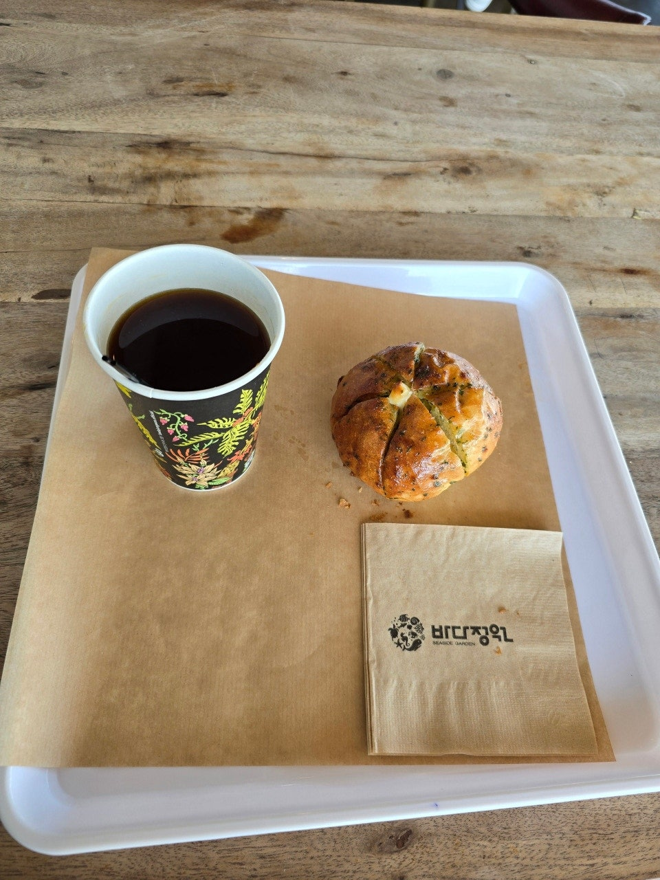 이곳의 시그니처인 마늘빵과 커피를 사서 4층에서 바다를 보며 커피한잔의 여유를 즐겨 봅니다.