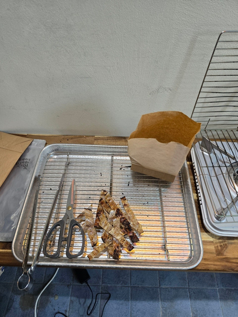 차를 타고 운전을 하면서 먹기 위해 건어물점에서 쥐포를 직접 구워 잘라 봉투에 담아 갑니다.