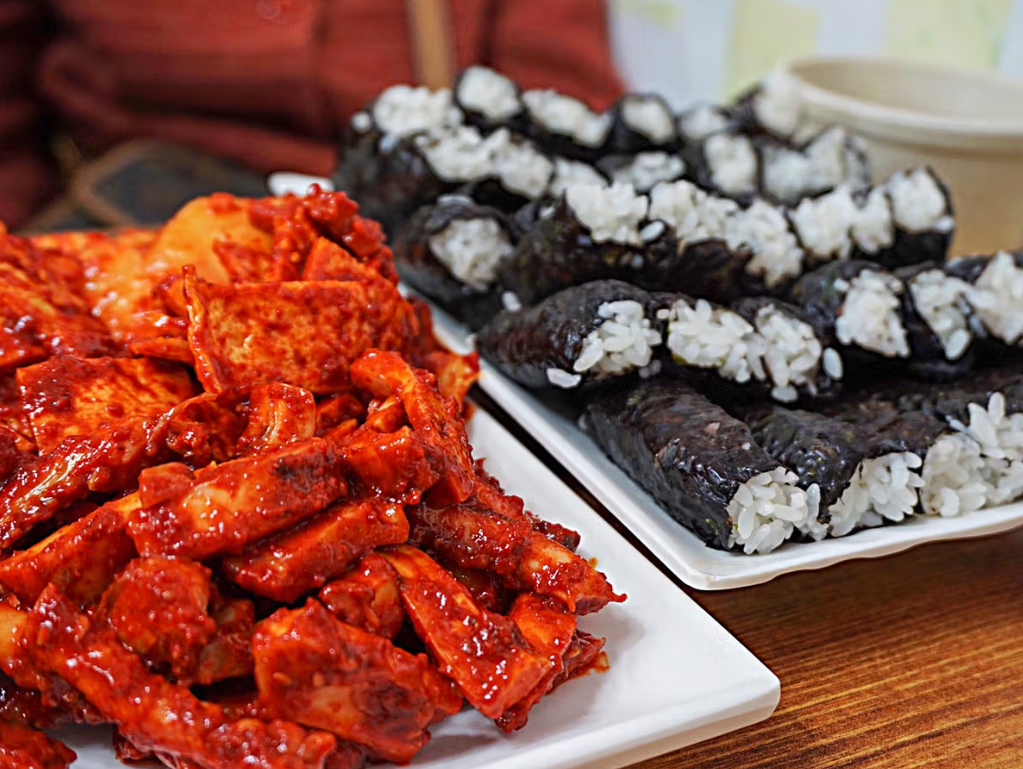 뚱보할매김밥집은 통영 먹거리의 상징인 충무김밥의 원조라고 할 수 있어요. 충무김밥은 하얀 쌀밥을 넣어 싼 김밥에 아삭한 무김치와 오징어무침을 곁들이는 음식이에요. 밥을 김으로 말은 일반 김밥과는 다른 충무김밥은 1930~1940년대부터 배를 타고 멀리 나가는 사람들이 더운 날씨에 쉽게 상하지 않도록 만들어 먹던 음식이라고 해요.