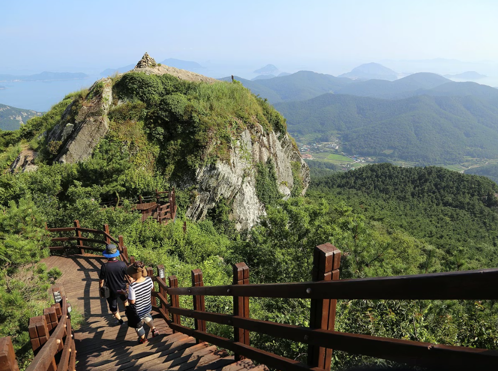 산봉우리에는 옛날 통제영의 봉수대 터가 있어 치열했던 역사를 떠올리게 해요. 통영에서 해전의 역사가 없는 장소를 찾기는 힘들죠. 걸어서 올라갈 수도 있지만 케이블카를 타고 올라가는 사람이 많은데 환상적인 전망을 보며 8부 능선까지 올라간 후 데크를 따라 정상에 오르면 탁 트인 모습이 펼쳐져요. 다도해의 절경, 한산도 대첩의 역사적 현장, 통영 시내의 전경 등 일석삼조의 멋진 모습을 좋은 바람과 함께 감상해 보세요.