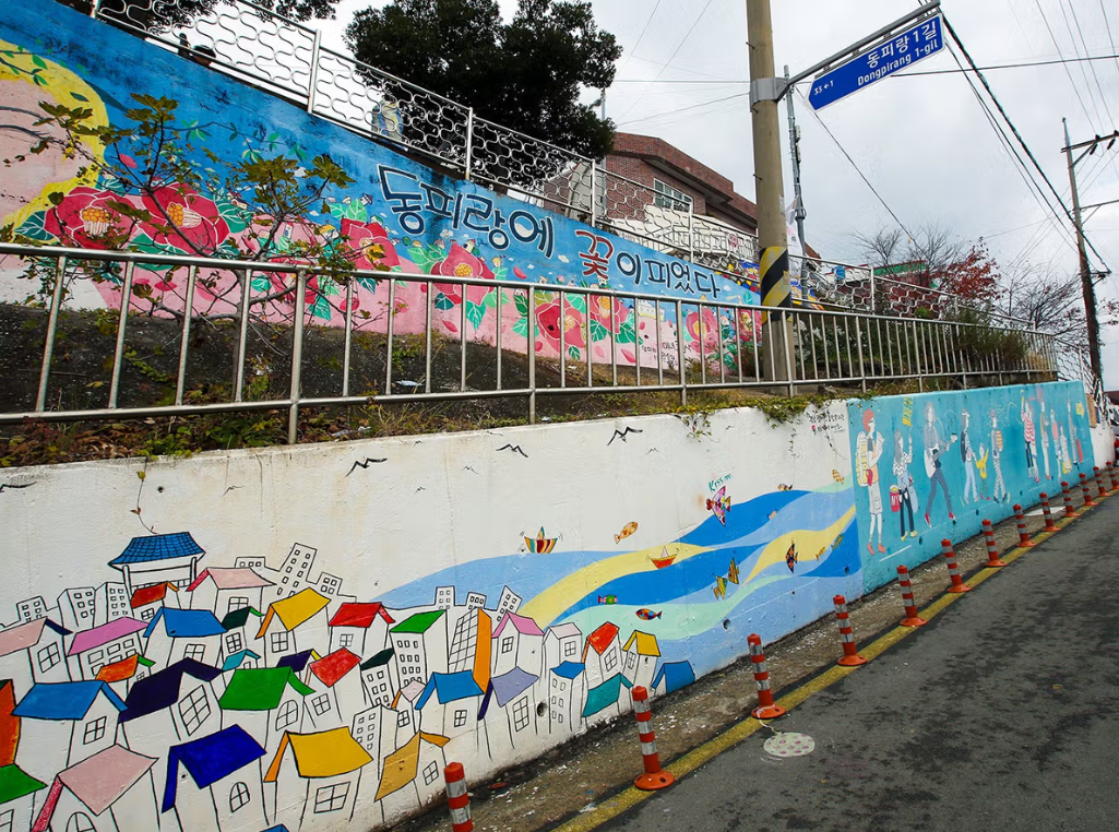 좁은 골목을 따라 예쁜 그림이 가득한 동피랑서피랑 벽화마을은 바다를 조망하는 벽화 마을이에요. 한때 재개발 위기에 처했던 마을은 이제 우리나라 벽화 마을을 대표하는 곳으로 자리 잡았죠. 벽화뿐 아니라 조형물도 많아서 사진을 찍느라 걸음을 옮기기 어려울 정도예요. 이곳에서 천사 날개를 배경으로 천사가 되어보거나 나비 날개를 배경으로 한 마리 나비가 되어보실 수 있어요.
