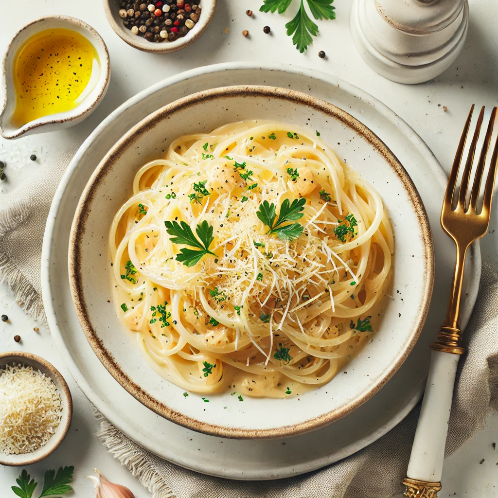 재료: 파스타 면, 생크림 200ml, 마늘, 베이컨, 양파, 파마산 치즈