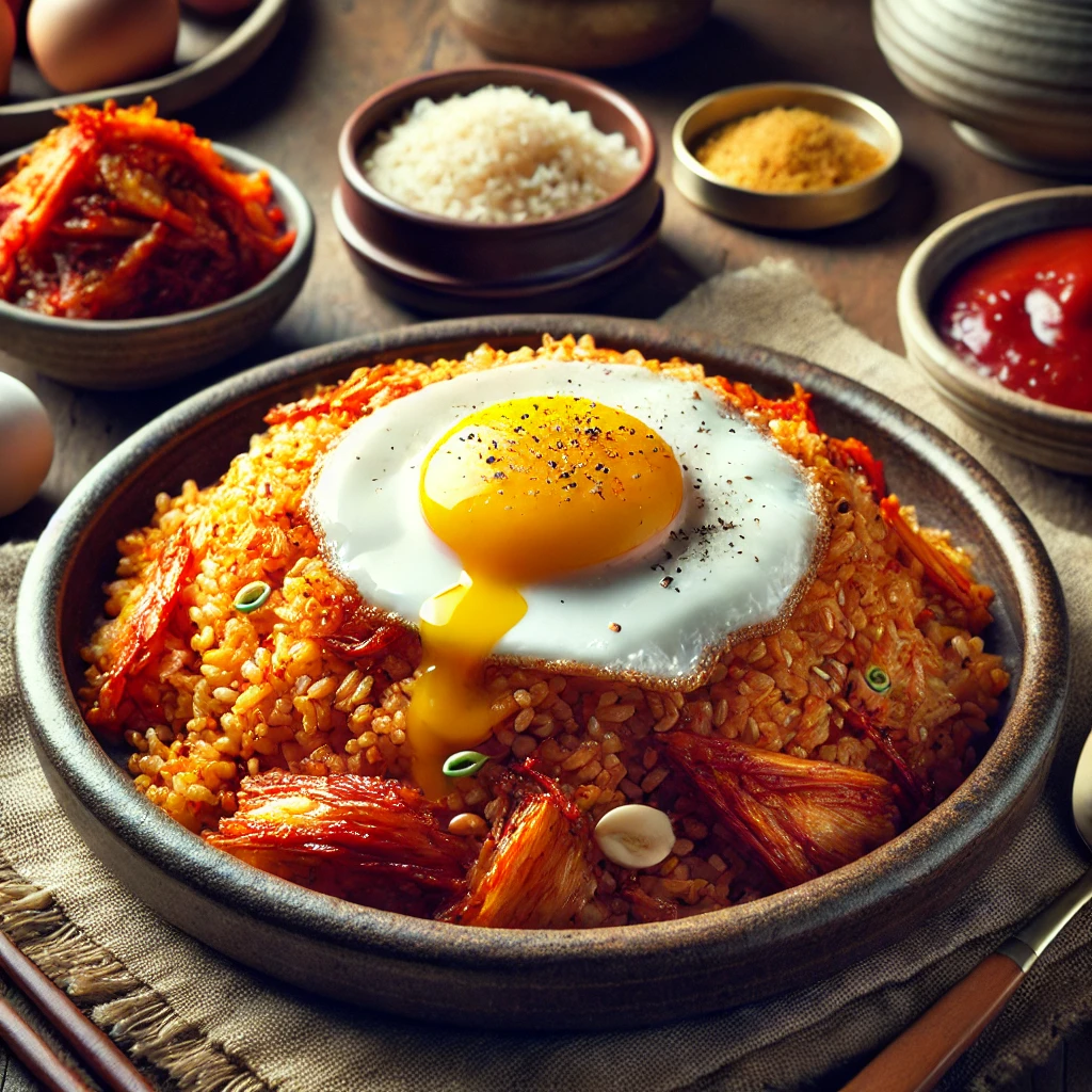 재료: 밥 1공기, 김치 1컵, 대파 1대, 계란 1개, 참기름, 고추장, 참깨